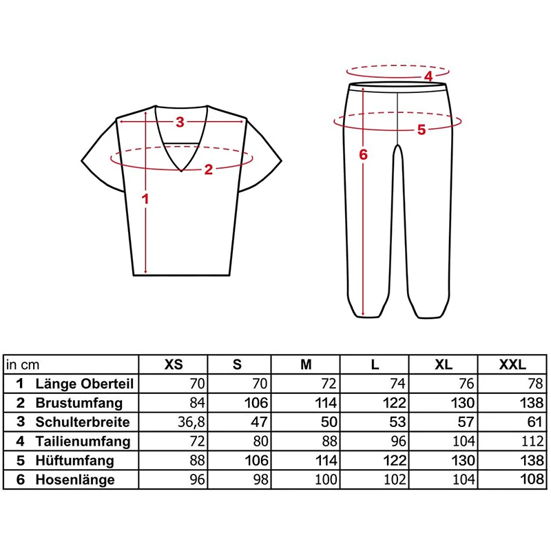 Size XXL: Top length: 80 cm; shoulder width: 54.8 cm; chest circumference: 124 cm; sleeve Length 20 cm; waist circumference: 112 cm, trouser length: 106 cm, hip circumference: 128 cm.